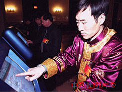 全國人大代表、江西貴溪市樟坪畬族鄉鄉長雷紀文九日在人民大會堂使用電腦查閱民族政策方面的文件資料。作者:陳勇