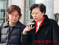 全國人大香港代表范徐麗泰(右)十日出席九屆全國人大三次會議全體大會退場時,接受記者追蹤采訪。作者:陳勇