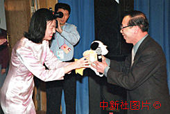 出席九屆全國人大三次會議的臺灣省代表張永鈞(右)十一日晚在部分人大代表的聯(lián)歡會上唱閩南歌曲大受歡迎。作者:羅仰明