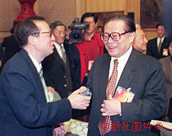 江澤民主席十四日到九屆全國(guó)人大三次會(huì)議北京代表團(tuán)參加討論,與科技界著名人士王選交談。中新社記者 李剛 攝