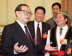 國家主席江澤民五日參加全國人大青海省代表團討論會,與代表們共話西部開發(fā)問題。作者:宗金柱