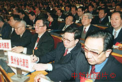 列席九屆全國人大三次會議開幕大會的各省市負責人,認真聽取朱镕基總理的政府工作報告。作者:李剛