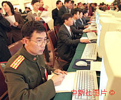 出席九屆全國(guó)人大三次會(huì)議開幕大會(huì)的解放軍代表,使用會(huì)議提供的電腦查閱有關(guān)資料。作者:王麗南