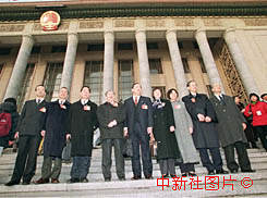 首次參加全國人代會的澳門代表團成員,五日參加九屆人大三次會議開幕式前在會場外留影。作者:宗金柱
