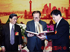上海浦東新區管委會常務副主任胡煒七日將一本編印精制的《浦東開發開放十年、江總書記十下浦東》影集,贈送江澤民主席。作者:于俊