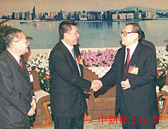 國家主席江澤民八日上午到全國人大澳門代表團參加討論會,與澳門特區行政長官何厚鏵握手交談。作者:李剛