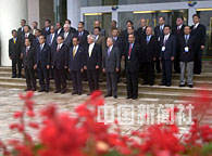 中國國家主席江澤民二十六日在海南博鰲水城集體會見出席亞洲論壇的貴賓,并在鮮艷的紅花叢前,與這些亞洲國家的前政要們和論壇秘書長合影。中新社記者 賈國榮 攝
