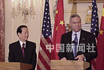 美東時間二十一日晚,中國國務院副總理錢其琛與美國國務卿鮑威爾,在美國國務院大樓舉行會談前會見記者,雙方希望繼續推進中美兩國關系向前發展。中新社圖 京華 攝