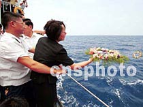 中國海上祭奠王偉烈士活動二十六日在海南三亞近海舉行。王偉夫人阮國琴淚灑大海,向王偉離去的方向拋去花環。中新社圖 張全躍 攝