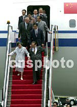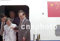 參加“2001年《財富》全球論壇”的中國國家主席江澤民與夫人王冶坪,5月8日中午乘專機抵達香港機場,香港特區行政長官董建華與夫人登機迎接。中新社傳真 任晨鳴 攝