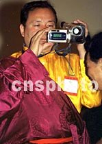 便攜式攝像機已進入西藏的寺廟,二十四日一位藏族喇嘛在西藏大廈內錄制節目,以便將外面的“世界”帶進市廟。中新社記者 宋吉河 攝