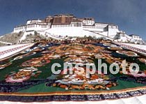 由西藏著名藝術(shù)家用一年多時(shí)間制成的巨型唐卡《至貴殊靈彩緞?wù)狗稹穼⒃诒本┱褂[的西藏文化展上展出。該唐卡高45米、寬35米,為世界之最,已被列入吉尼斯世界記錄。中新社圖 吳新華 攝