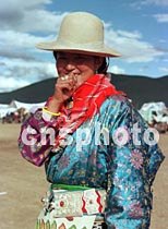一位藏北牧區的藏族女青年八月中旬到當雄縣參加物資交流會時,身穿華麗的藏袍,佩玉戴銀,面對客人保持純樸的笑容。中新社圖 趙偉 攝