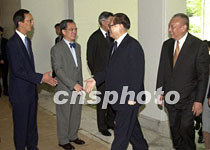 國家主席江澤民五月九日出席香港特別行政長官董建華舉辦的午宴前與特區主要官員握手。中新社傳真 任海霞 攝