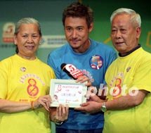 歌星張學友18日在香港出席粵港澳耆英饑饉8小時壓軸節目「香江暖流獻中華音樂會」,頒贈紀念品予出席長者。中新社傳真鄧慶樂攝