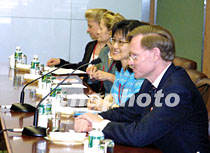 石廣生會見美貿易代表 雙方還將進一步商議 2001年6月5日 15:44 ![]() 石廣生與美國貿易談判代表羅伯特·佐立克一行會晤。中新社記者 潘索菲 攝 ![]() 二○○一年APEC貿易部長會議將于六月六日開幕。會議主席、中國外經貿部部長石廣生和中國代表團團長、外經貿部首席談判代表龍永圖,五日在上海國際會議中心與經濟體代表團團長舉行雙邊會談。圖為美國貿易談判代表羅伯特·佐立克。中新社記者 潘索菲 攝