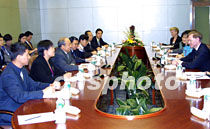 二○○一年APEC貿易部長會議將于六月六日開幕。會議主席、中國外經貿部部長石廣生和中國代表團團長、外經貿部首席談判代表龍永圖,五日在上海國際會議中心與經濟體代表團團長舉行雙邊會談。圖為石廣生與美國貿易談判代表羅伯特·佐立克一行會晤。中新社記者 潘索菲 攝