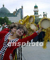 6月14日,“北京——莫斯科申奧萬里行”鳳凰車隊進疆抵達哈密市,當地民眾在哈密王陵前面舉行盛大儀式,歡迎遠道而來的客人。由哈密歌舞團表演的“哈密瓜”等民族歌舞奔放熱烈,表達了維吾爾族人民對北京申奧活動的深情厚誼。中新社圖 魏孝明 攝