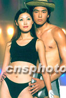 日前,在大連舉行的2001新絲路中國模特大賽大連賽區上,參賽的選手身穿泳裝展示。中新社記者 錢興強 攝