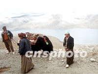 八月是西藏旅游的黃金季節,藏民牽著牦牛在美麗的羊卓雍湖邊迎候游人,他們以為游客提供照相服務而增加自己的收入。中新社記者 滿會喬 攝