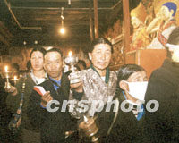 八月的西藏拉薩,前往大昭寺朝拜釋迦牟尼佛像的藏民絡繹不絕。相傳這里供奉的釋迦牟尼佛像為唐朝初年文成公主帶入西藏。中新社記者 滿會喬 攝