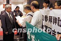 香港多個團體15日舉行示威游行,抗議日本首相小泉純一郎參拜靖國神社。圖為香港教聯會向日本駐港總領事館遞交抗議信函。中新社圖 盧峰 攝