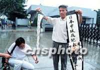日本首相小泉純一郎參拜靖國神社,引起了中國人民的極大憤慨。南京市民以集會、簽名等各種形式表示強烈抗議。南京氣象學院71歲的傅逸賢副教授日前在南京大屠殺遇難同胞紀念館門前焚燒日本戰犯的模擬牌位。中新社圖 祁恩芝 攝