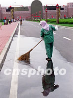 一位女工20日在大連國際會議中心前清潔路面,為將于23日召開APEC第十三屆部長級會議第三次高官會作好準備。中新社記者 王瑤 攝