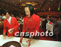 西安唐樂宮的服務員五日以唐代禮節為參加西部論壇的賓客準備茶水,會上近二百家國內外企業的代表在此進行了項目洽談。中新社記者 宋吉河 攝