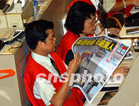9曰12日上午,香港聯交所的交易員閱讀關于美國局勢的報紙。中新社圖 任晨鳴 攝