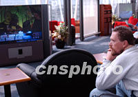 部分因美國紐約世界貿易中心等地恐怖襲擊而滯留香港國際機場的旅客,12日中午焦慮的在候機室屏幕前,關注事態發展。中新社圖 洪少葵 攝