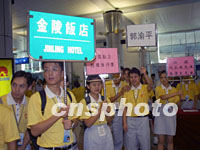 出席第六屆世界華商大會的國內(nèi)工商界人士十六日陸續(xù)抵達(dá)南京,來自南京各高校的志愿者在機(jī)場熱情接待來賓。中新社記者 史利 攝