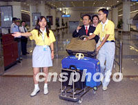 服務(wù)于第六屆世界華商大會的志愿者十六日在南京機(jī)場迎接參加大會的來賓,華商會十七日將在南京拉開帷幕。中新社記者 史利 攝