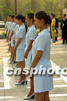 訓練有素的禮儀小姐十六日在南京國際會展中心門口迎候出席世界華商大會的代表們。中新社記者 史利 攝