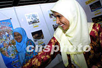 身著民族服飾的馬六甲小姐在同期舉行的“經貿交流展”上,向參加華商大會的代表們介紹馬六甲風情。中新社記者 鄭萍萍 攝