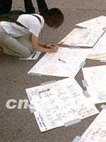 紐約華埠孔子廣場平整的紅色地面上,近日貼著許多白色卡紙,上面用中英文寫著譴責(zé)恐怖活動;悼念“九一一”死難者;祈求世界和平;以及支持重建世貿(mào)中心大廈的字句和詩篇。圖為一位華裔女青年跪在地上寫下自己的心愿。中新社圖 龔文謨 攝