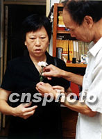 美國“九一一”恐怖事件中不幸遇難的中國公民鄭于光、楊樹蔭夫婦在福州的三妹夫陳少民二十日清晨于家中為啟程赴美吊唁親人的妻子鄭嫦英戴上白菊花,寄托哀思。中新社記者 劉可耕 攝