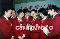 上海航空公司乘務(wù)部把迎APEC會(huì)議英語(yǔ)100句列入日常服務(wù)英語(yǔ)訓(xùn)練之中,以充實(shí)服務(wù)英語(yǔ)的內(nèi)容,提高空中服務(wù)人員的口語(yǔ)水平。圖為航班準(zhǔn)備前空隙,乘務(wù)員在閱讀交流。中新社圖 夏本建 攝