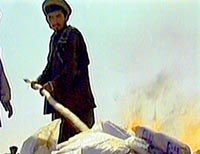 在美國大兵壓境的背景下,阿富汗北方聯(lián)盟和塔利班之間的內(nèi)戰(zhàn)日前更趨激烈。圖為北方聯(lián)盟士兵在焚燒從塔利班控制地區(qū)內(nèi)搜獲的海洛因,海洛因據(jù)稱是拉登恐怖組織重要的資金來源。