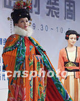 2001中國青島時裝周暨服裝服飾博覽會正在青島舉行。圖為中國名模姜培琳與新絲路模特在展示中國歷代服飾作品。中新社記者 錢興強(qiáng) 攝