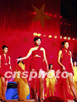 正在青島舉行的2001中國青島時裝周暨服裝服飾博覽會,國慶節(jié)之際舉行大型文藝晚會“海韻霓裳”。圖為五星紅旗下模特表演。中新社記者 錢興強(qiáng) 攝