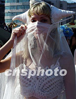 來自俄羅斯的模特,日前在青島舉行的2001中國青島時裝周上進行服裝展示。中新社記者 錢興強 攝