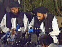 英美發動針對阿富汗的軍事打擊后,阿富汗塔利班駐巴基斯坦大使扎伊夫(右)發表講話指出,這是對阿富汗人民的恐怖襲擊,阿富汗人民將予以堅決回擊,美國妄圖破壞伊斯蘭制度的企圖終將不能得逞。
