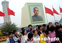 一班少男少女們十月歡聚在北京天安門廣場上的巨幅孫中山先生畫像前,游覽中懷念辛亥革命的先驅。中新社記者 賈國榮 攝