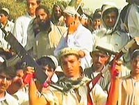 巴基斯坦城市卡拉奇日前發生大規模反美示威游行,一少年高舉玩具槍表示對美軍空襲阿富汗的抗議。