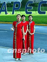 為上海十月APEC會(huì)議服務(wù)的禮儀小姐,身穿紅色中式滾花邊旗袍,富有中國(guó)南方女性溫柔端莊的氣質(zhì)。中新社記者 賈國(guó)榮 攝