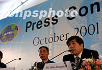 APEC工商咨詢理事會主席秦曉(左)、秘書長霍建國十五日在上海APEC新聞發布會上表示,APEC對當前世界前沿問題進行探討并達成共識具有重要作用。中新社記者 潘索菲 攝