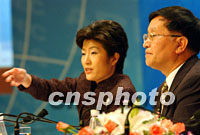 中國國家發展計劃委員會副主任張國寶(右)十六日在上海出席外交部發言人章啟月主持APEC國際新聞中心舉行發布會,介紹西部開發時談到美國空襲阿富汗沒有對中國有影響。中新社記者 賈國榮 攝