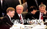 10月17日,2001年亞太經(jīng)合組織(APEC)部長級會議在上海國際會議中心開幕。這是美國和越南的代表在會前各自進(jìn)行交談。中新社圖