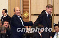 十八日上午出席上海APEC雙部長會議的俄羅斯外長伊萬諾夫(左)與美國貿易代表左立克相見言歡。中新社記者 毛建軍 攝